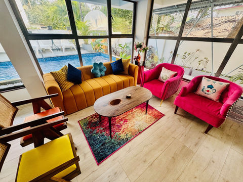![Mela is a pop-style villa cum hotel designed for stays that feel fun, expressive, and full of character. Bright interiors, statement details, and thoughtfully designed spaces come together to create a setting that’s anything but ordinary. Located in Calangute, it keeps you close to the action while still offering a private, comfortable escape to come back to.